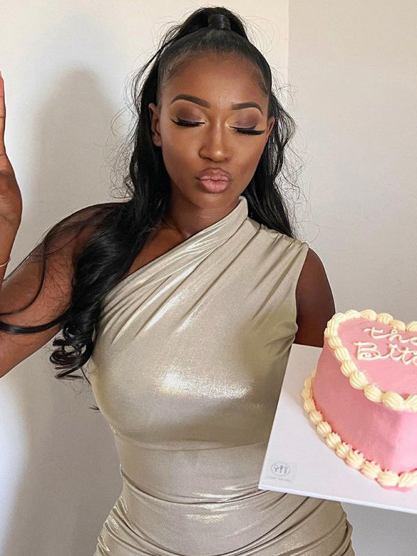 New Sexy Slim Solid Color Slant Shoulder Sleeveless Hip Dress